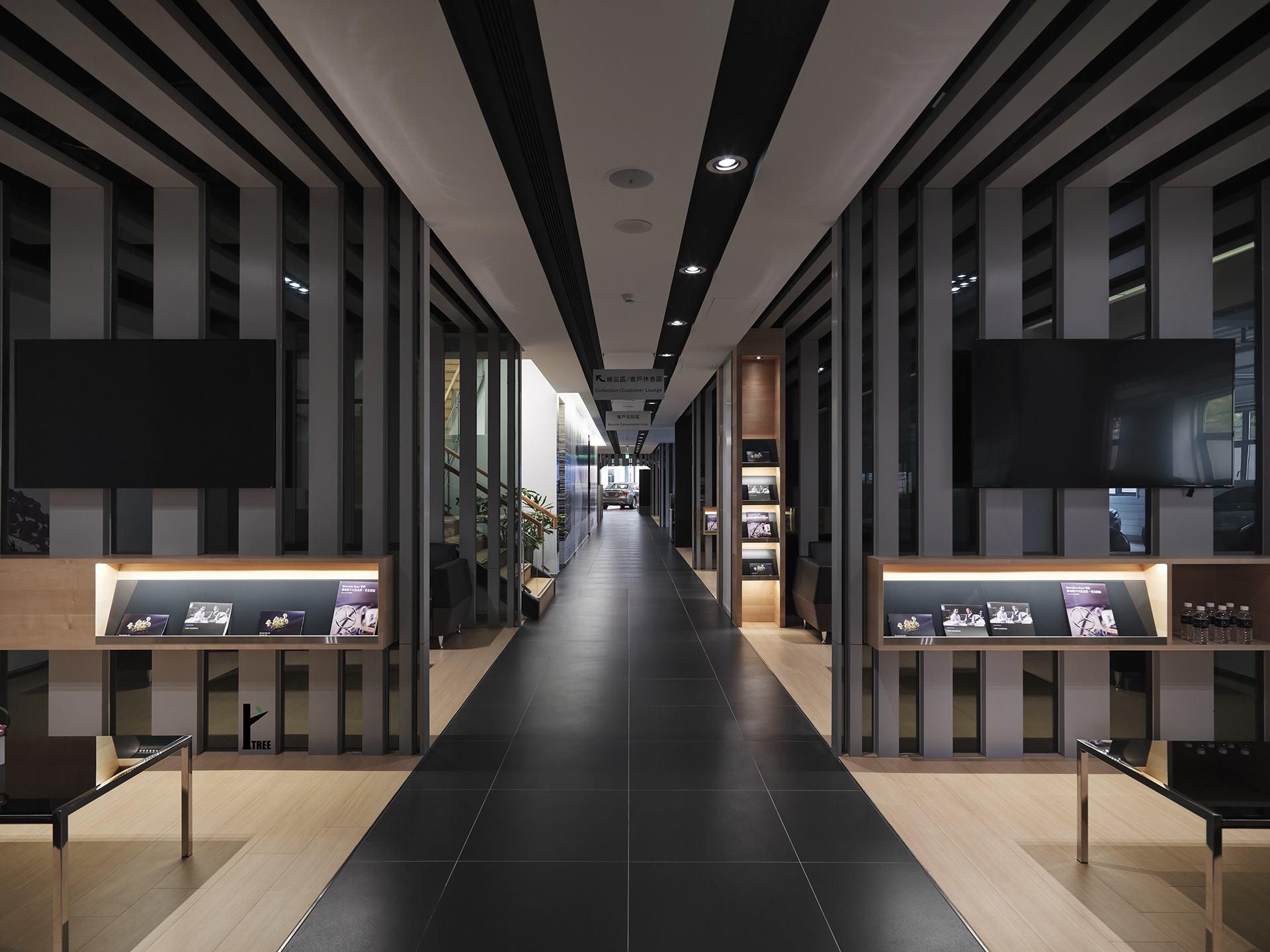 整體設計由建築基地開始規劃,基地為台灣典型街屋的狹長型態,扣除車道空間後剩餘空間作為客戶服務休息區,利用分割牆面拉開產生的縫隙進行弱化分割讓視覺上產生穿透感,並透過梯間天光模擬與周圍環境形成明暗氛圍,配合慣性的行為模式引導顧客動線,且以不同材質鋪陳天地並界定動靜虛實的不同空間區域整體設計由建築基地開始規劃,基地為台灣典型街屋的型態,扣除車道空間後剩餘空間作為客戶服務休息區,利用分割牆面拉開產生的縫隙以弱化進而讓視覺上產生穿透感,並透過梯間天光摸擬與周圍環境形成明暗氛圍,配合慣性的行為模式引導顧客動線,且以不同材質鋪陳天地並界定動靜虛實不同空間區域。