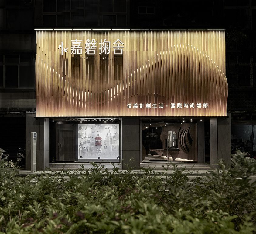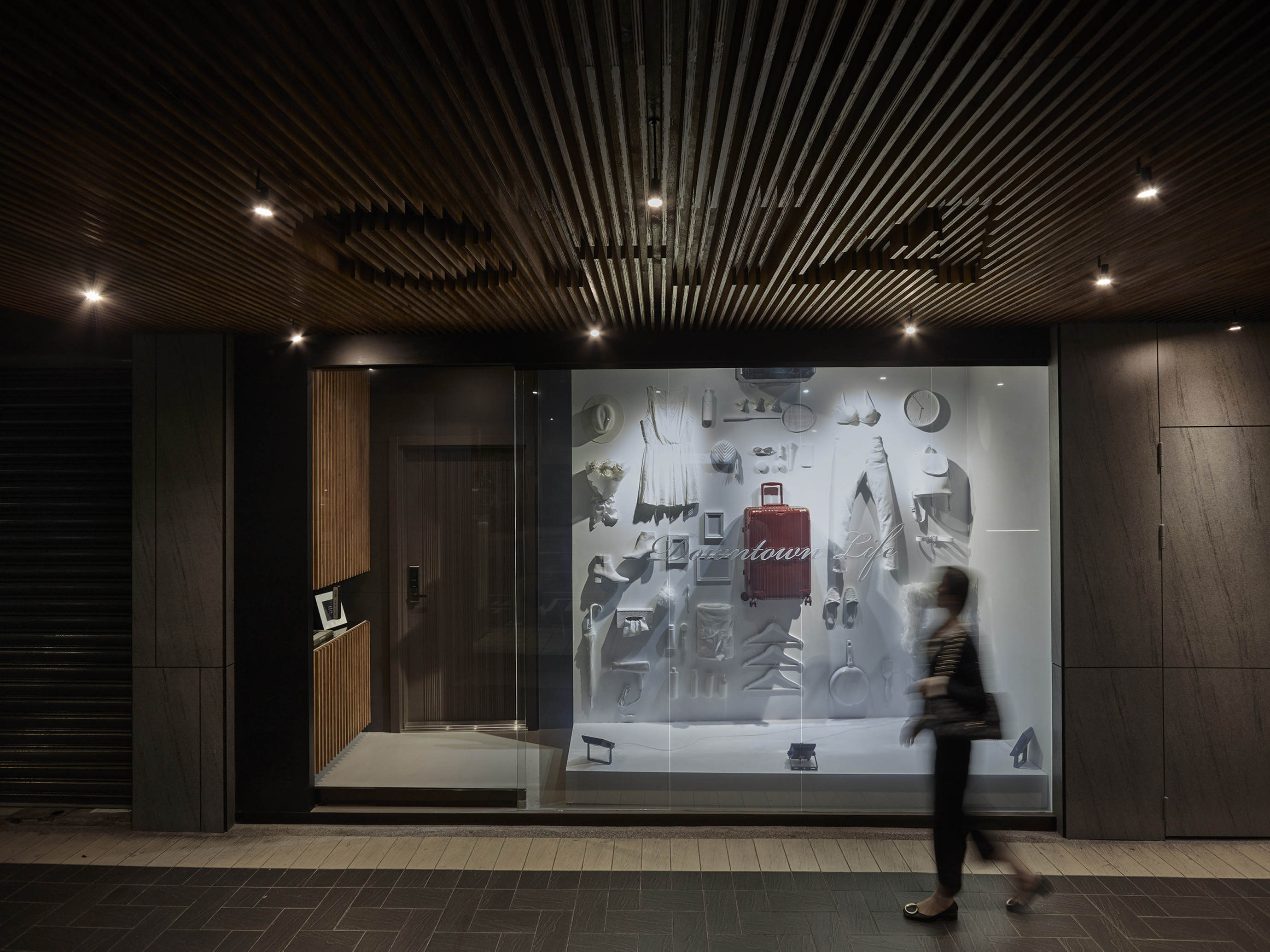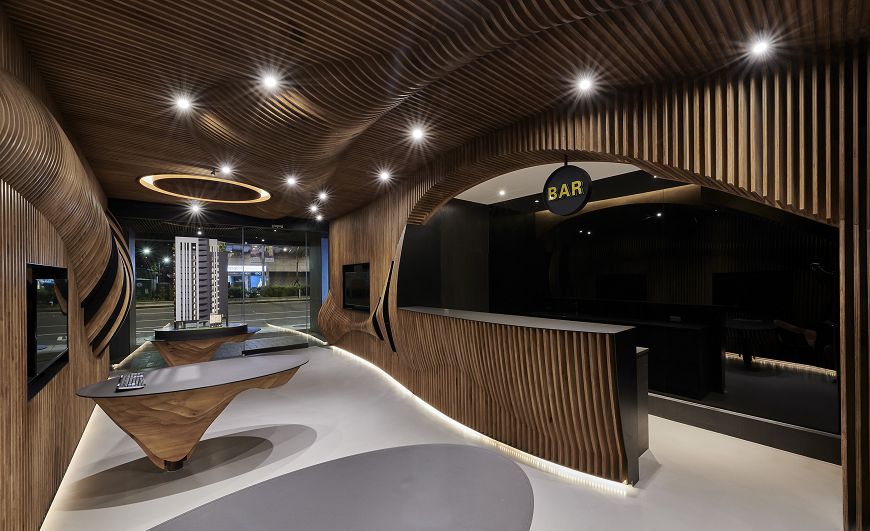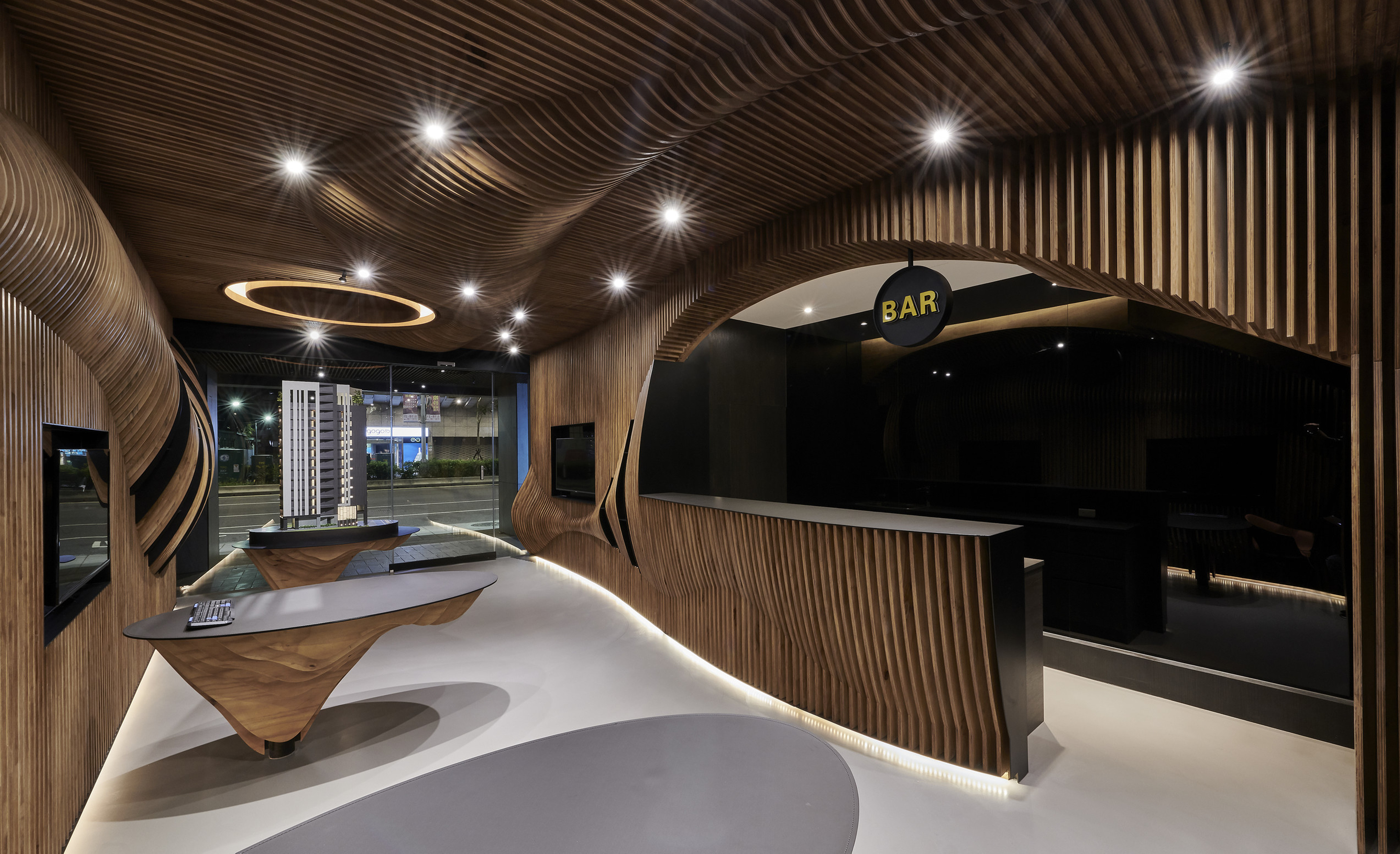 本案包含二個街邊店面,右邊售樓處,左邊樣板房,二樓以上的建築立面是一個大型廣告牌,若一個都市尺度的櫥窗。二個店面被設計成二個精品櫥窗的概念,右邊售樓處的櫥窗擺一個建案模型,視覺上是一個精品店櫥窗裡擺了個房子的概念。左邊樣板房的櫥窗佈置了特別意象,因這房子都是帶裝修賣的,未來的主人只需拎包入住即可。把所有生活所需的對象漆成白色,櫥窗中央擺了個紅色行李箱,強化銷售策略之餘,讓人以為是個賣名牌服飾之類的精品櫥窗。 我們想要把居住這件事回歸到最原始的狀態,像遠古人住在窯洞裡,因此,所有的空間,以及生活的道具都是同樣的一種材料,空間中不會出現直線或是直角,視線裡盡是歷經時間的更迭所產生空間的綿延。