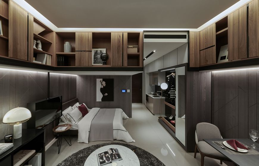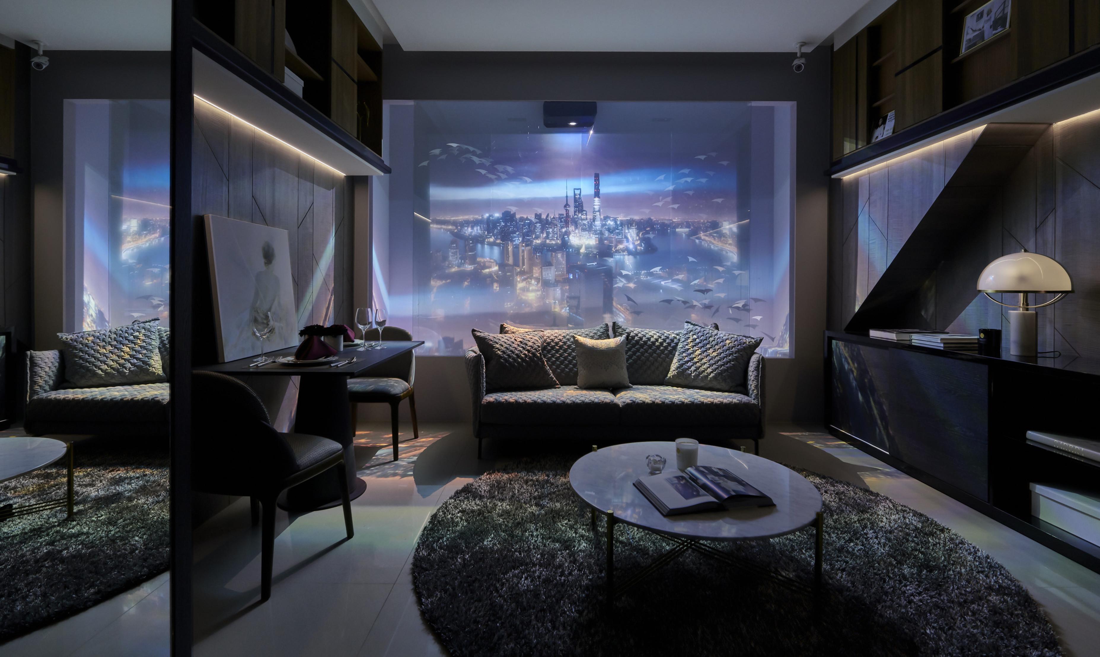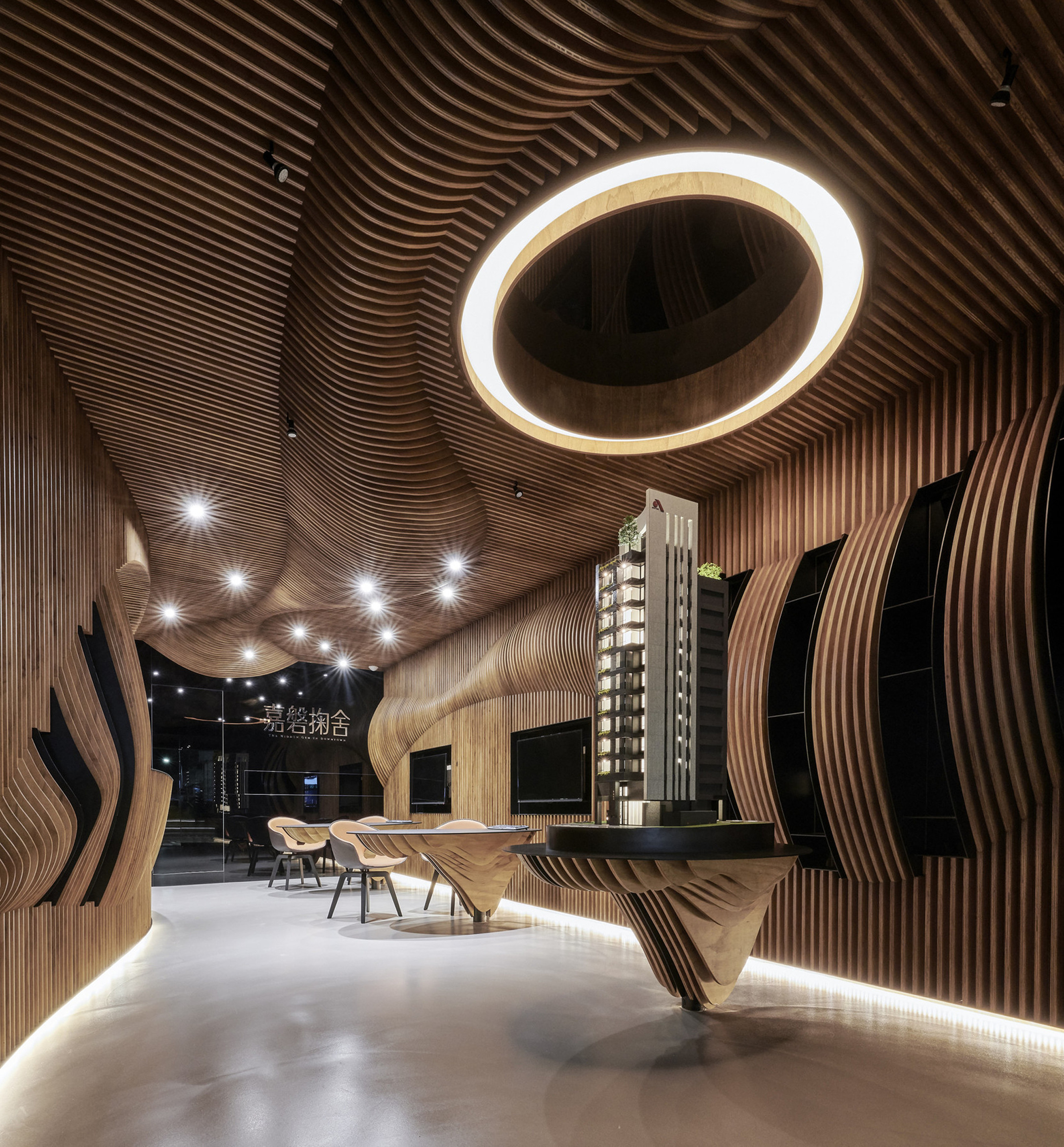 本案包含二個街邊店面,右邊售樓處,左邊樣板房,二樓以上的建築立面是一個大型廣告牌,若一個都市尺度的櫥窗。二個店面被設計成二個精品櫥窗的概念,右邊售樓處的櫥窗擺一個建案模型,視覺上是一個精品店櫥窗裡擺了個房子的概念。左邊樣板房的櫥窗佈置了特別意象,因這房子都是帶裝修賣的,未來的主人只需拎包入住即可。把所有生活所需的對象漆成白色,櫥窗中央擺了個紅色行李箱,強化銷售策略之餘,讓人以為是個賣名牌服飾之類的精品櫥窗。 我們想要把居住這件事回歸到最原始的狀態,像遠古人住在窯洞裡,因此,所有的空間,以及生活的道具都是同樣的一種材料,空間中不會出現直線或是直角,視線裡盡是歷經時間的更迭所產生空間的綿延。