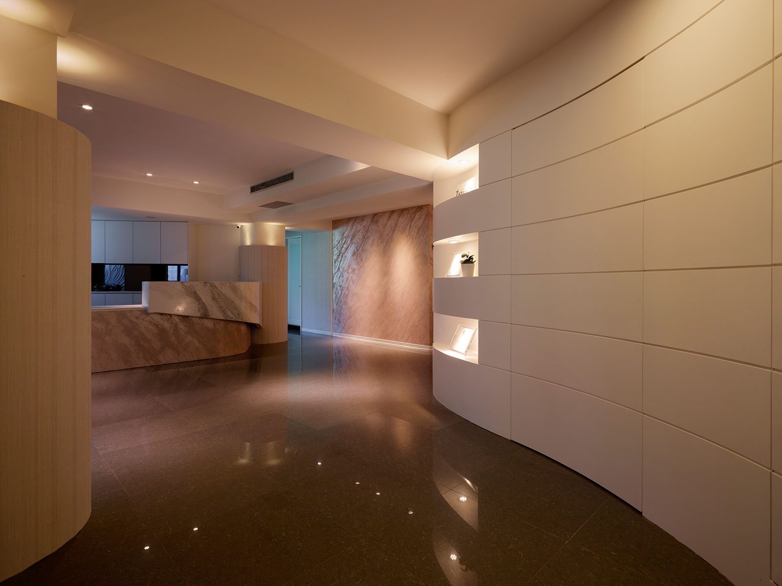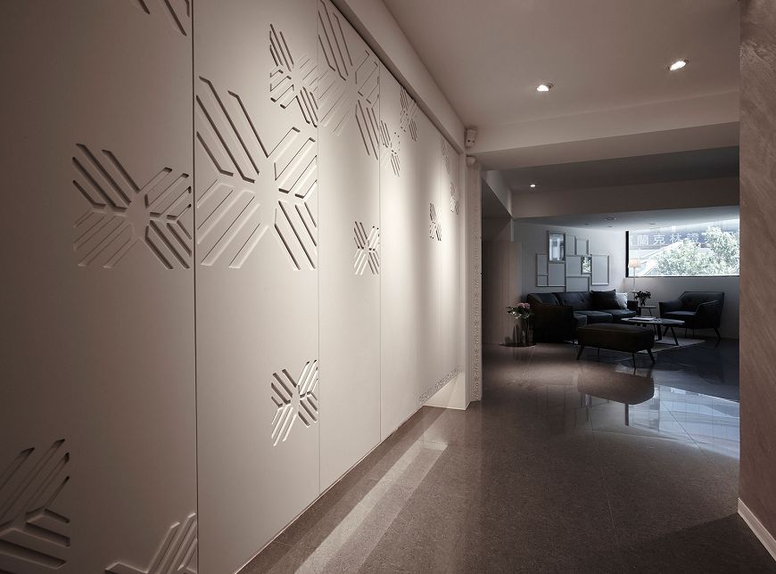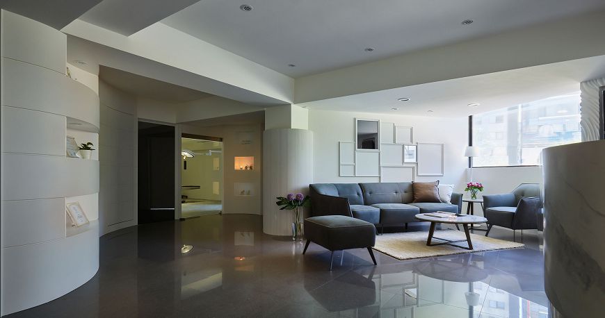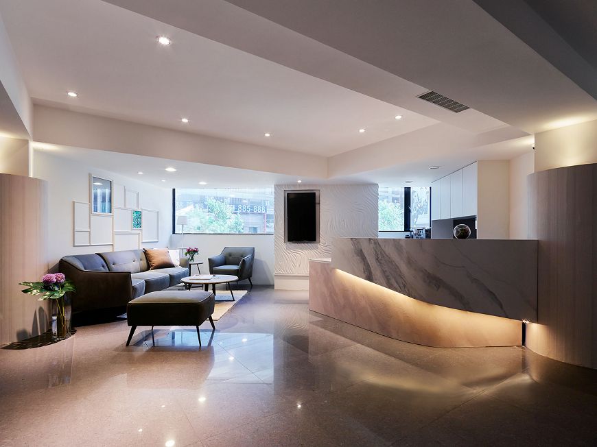 『始終相信,美麗沒有終點』是院所的理念與宗旨,為了營造沒有終點的設計,我們化角為弧、去稜從圓。 空間擬人以優美柔軟的長波浪造型呈現主體,涵有女人溫柔婉約、身型窈窕的意象,緩和的曲線牆如隨音樂律動的五線譜蜿蜒整個空間,帶出自在悠然的氣息,修飾曲折不協調轉為圓,延展出更舒適寬敞的空間。 候診時間靜靜享受每盞水晶燈下的優雅氣息,細聞香氛蠟燭洩出的安心與浪漫,悠然自在迎來美麗的改變。