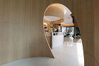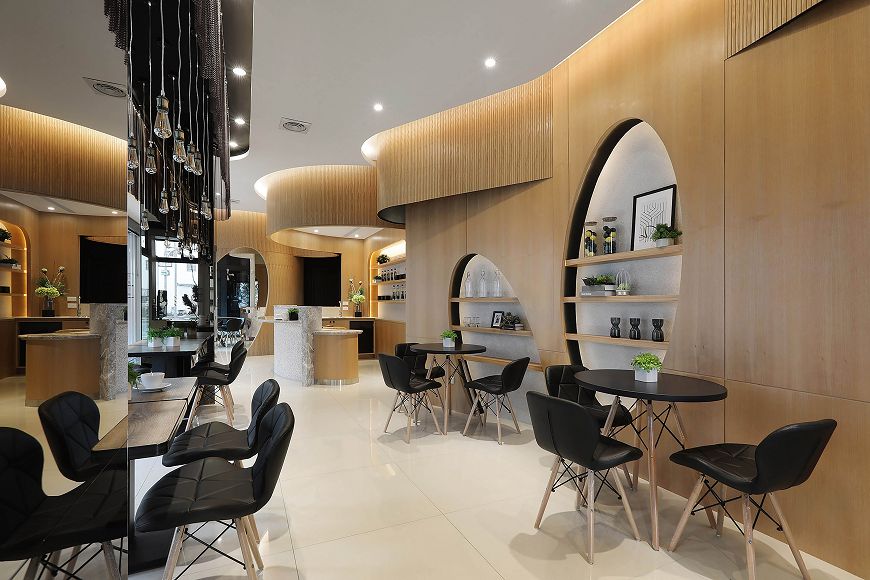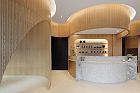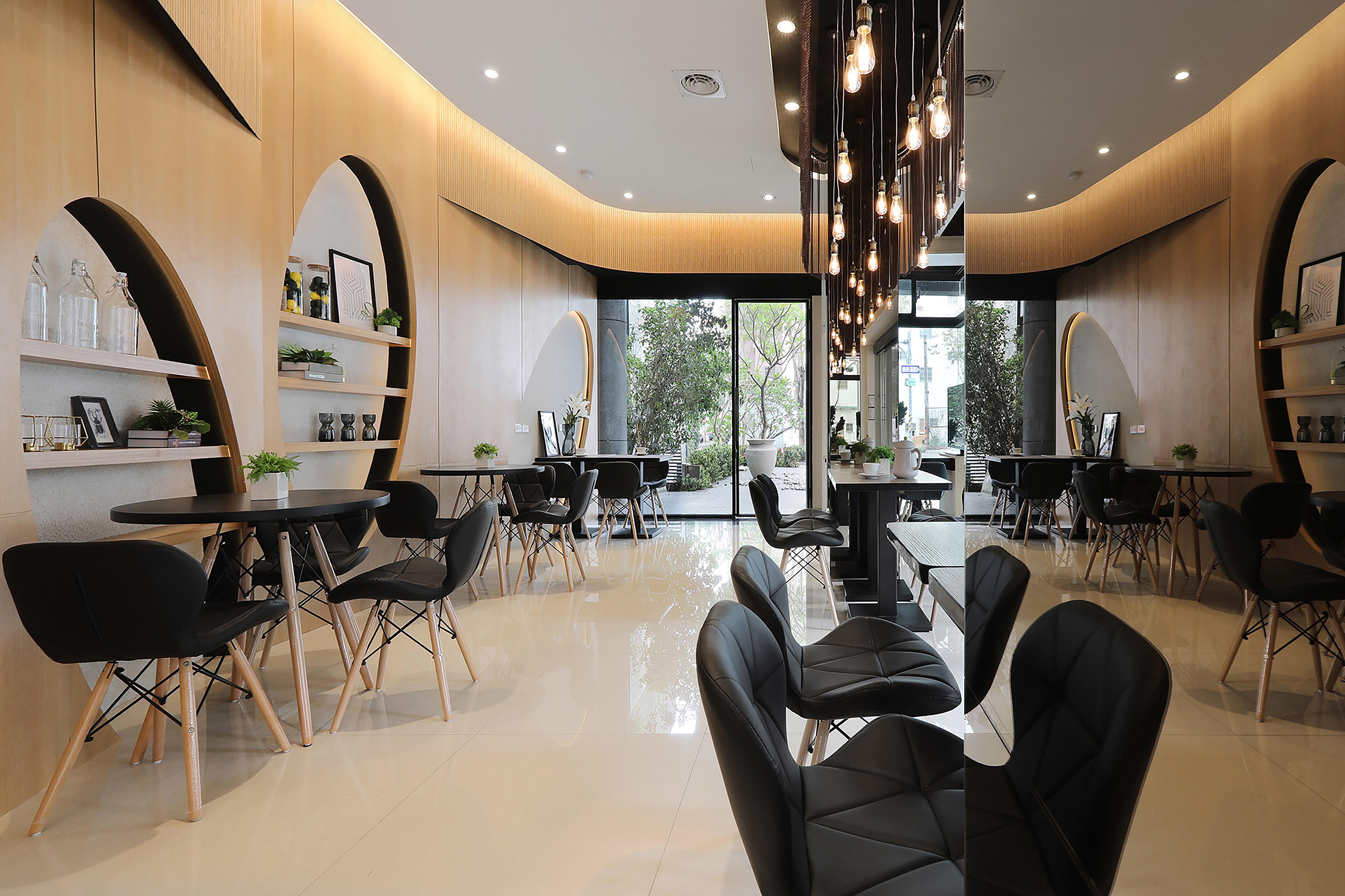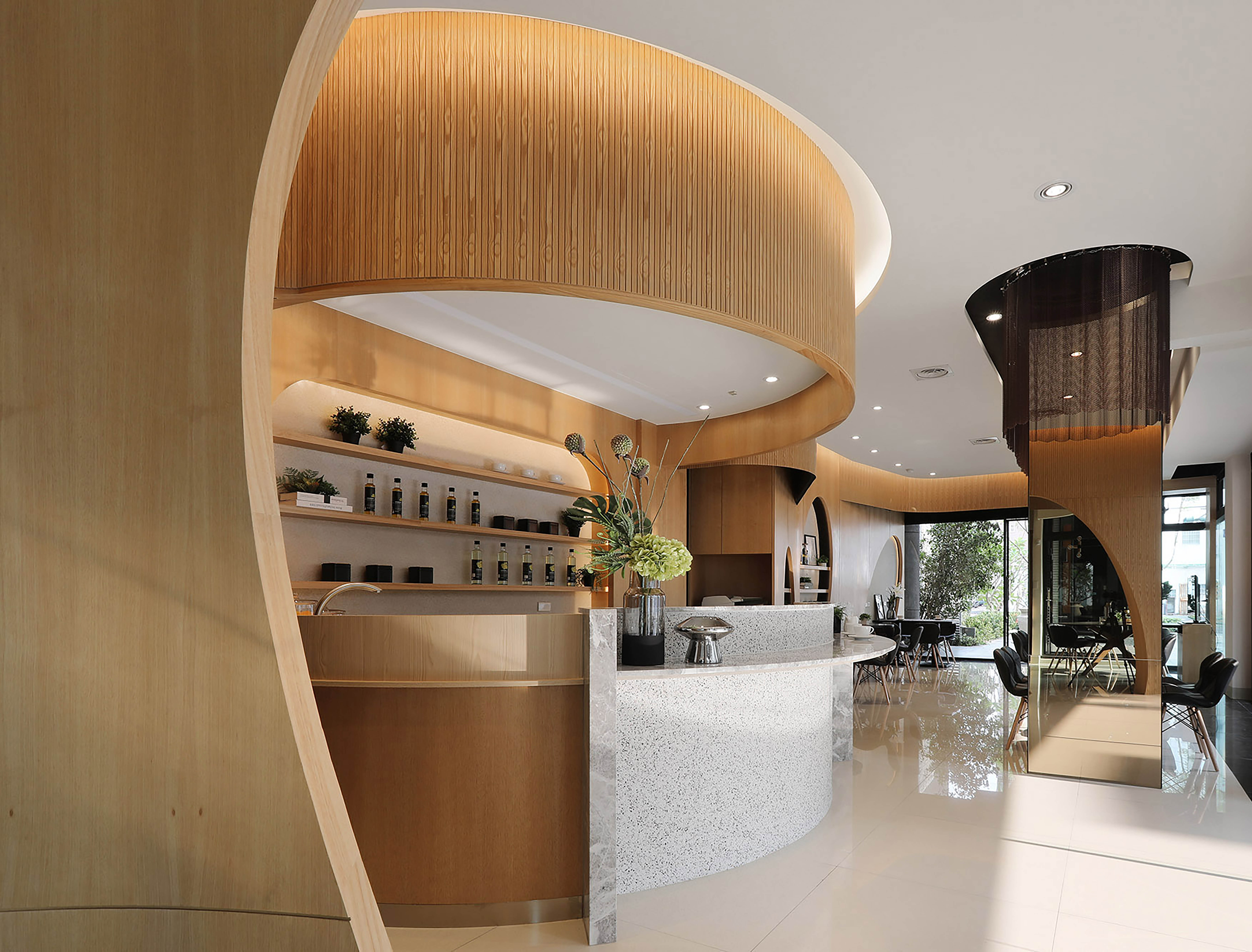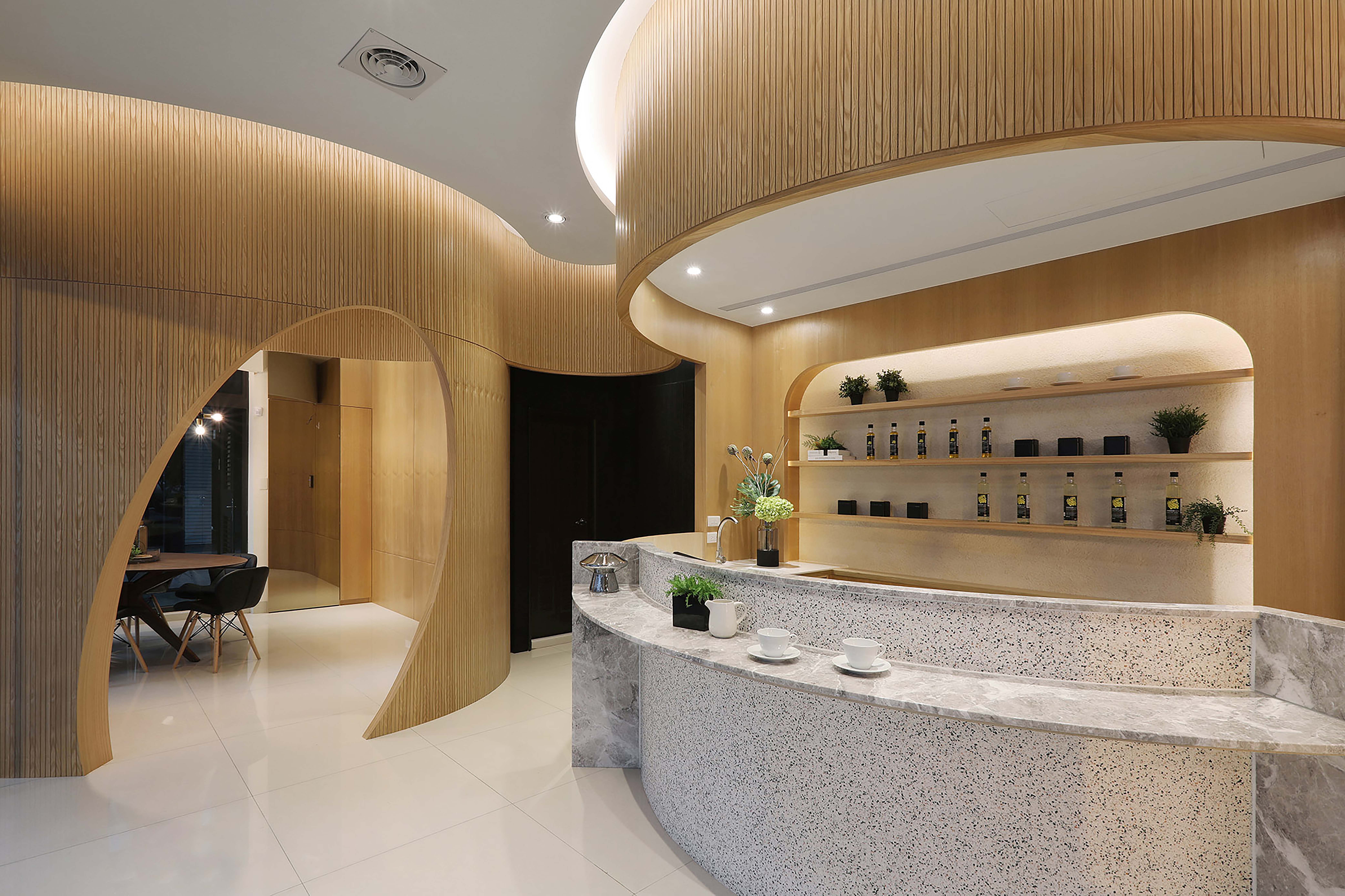 本建案銷售接待中心設計案,屬於透天式帶有商業空間的接待中心會館,基地本身條件狹長窄型,空間中又有結構柱,與一般大型寬敞的空間條件相左。長型的空間,容易讓內部產生單調及壓迫感,如何能突破這樣的條件限制,將其轉換為優勢? 最終我們嘗試以『圓形+曲面』的手法,來軟化其生硬感,增加柔軟特質,同時試圖將接待中心之樣貌,模擬未來店舖之商業,共同呈現,於是本案顛覆一般接待銷售中心的設計模式,讓木皮與金屬流蘇加以圓弧面,共同構成流暢、休閒時尚感十足的空間,溫暖的木質調加上流暢的動線及質感,完全顛覆人們對於銷售中心的想像。