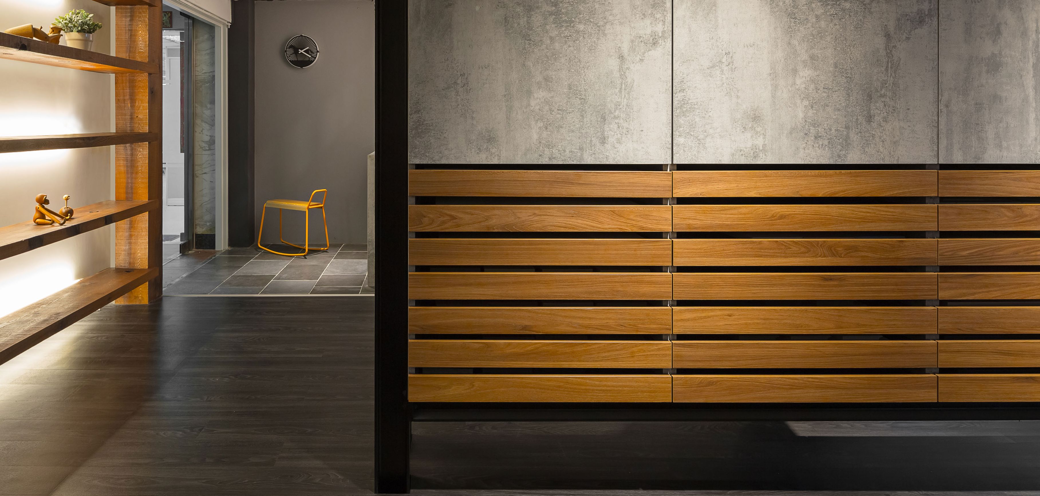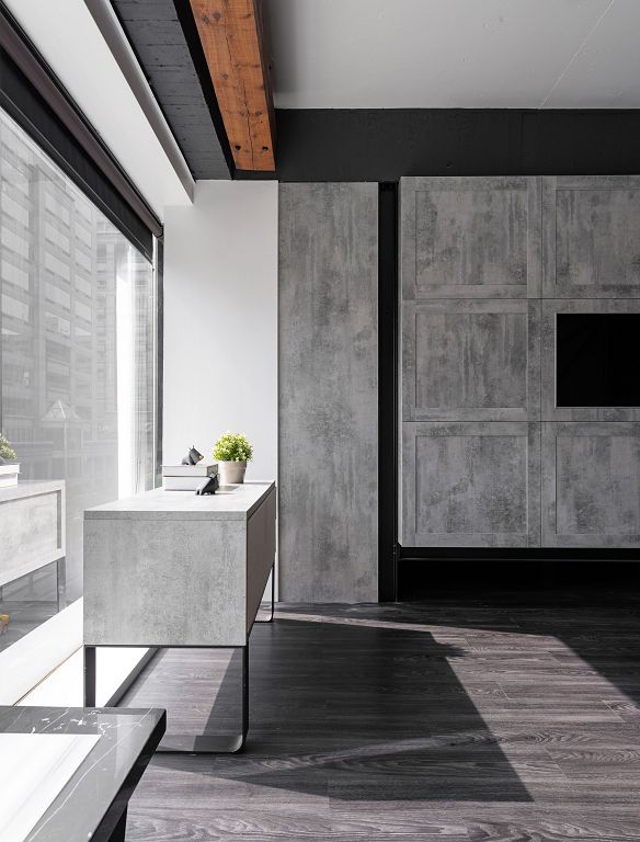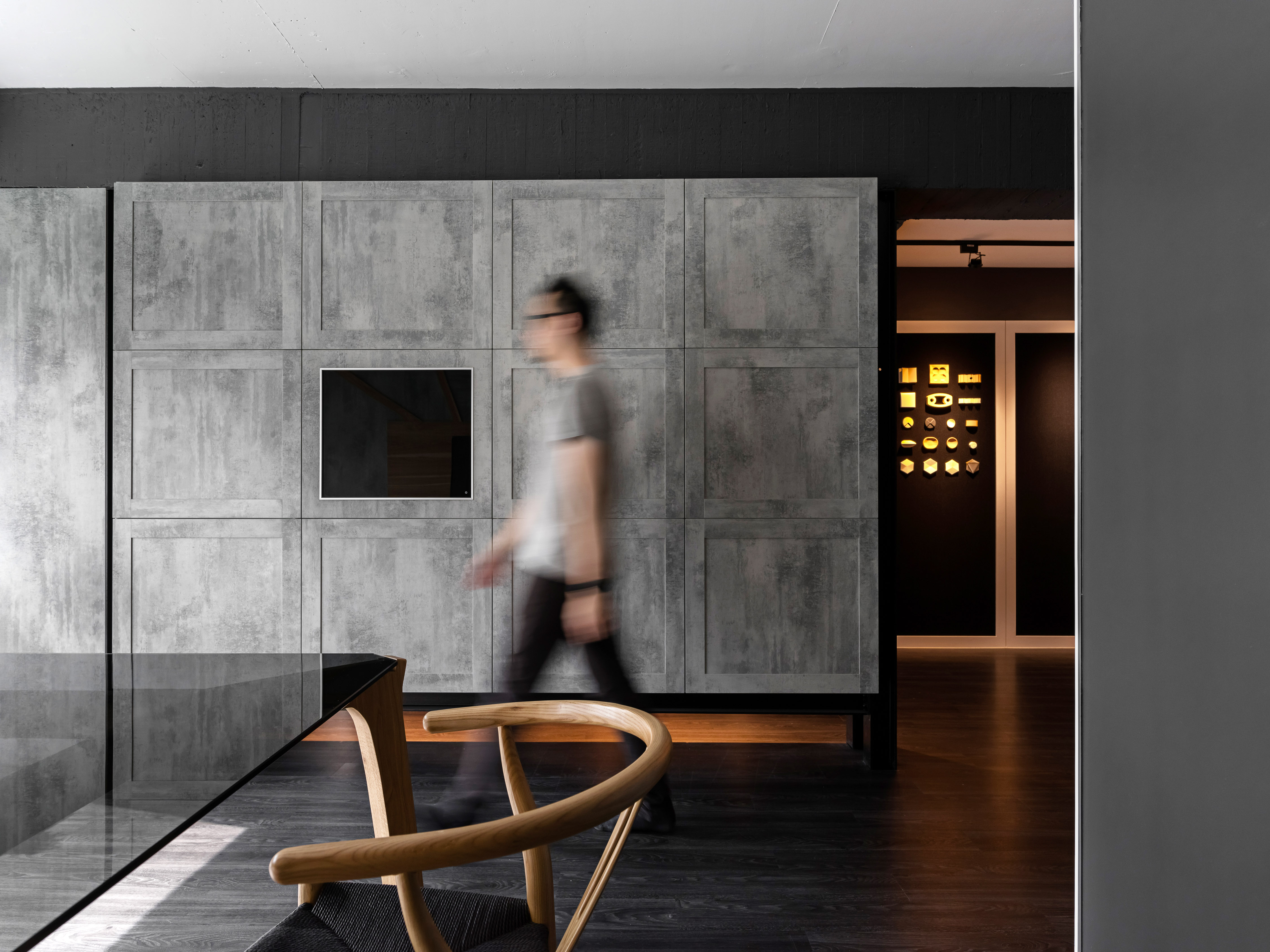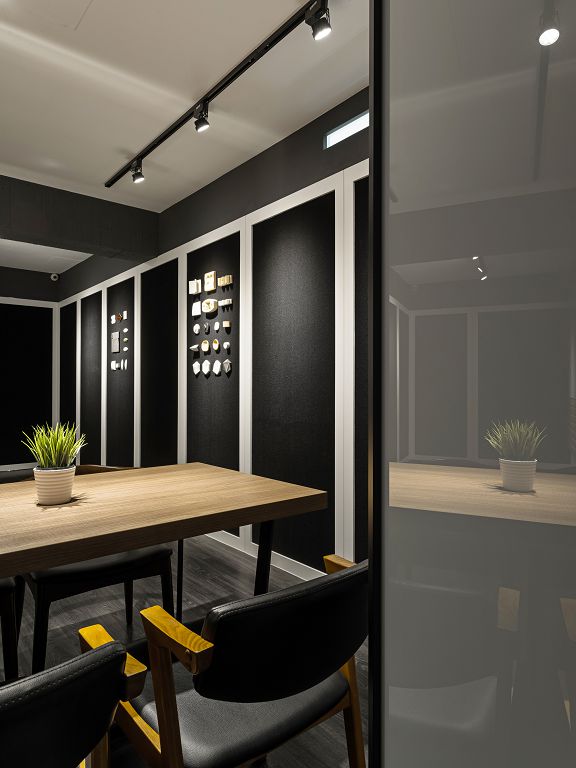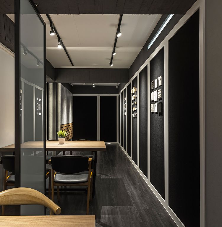 靈感: 靈感來自於桃園的彩繪壁畫。位於桃園市蘆竹區坑口彩繪村,是集合各地藝術家創作的壁畫彩繪社區,來自世界各地的藝術家們,透過壁畫來表達出他們的精神和理想。牆壁上的彩繪作品,宛如精品一般的展出,令我十分的感動。 說明: 販售建築材料的商業辦公室,採用溫暖的木材、烤漆的鋼材。在討論開始時,客戶要求建造一個材料室。提到了許多的設計規劃,討論了各種可能性。最後,我提出了這種壁畫式類型的設計,將客戶產品展示在開放的牆面上。 整體視覺效果集中在黑色和暖色的木紋上。會議室的中心上方是大型木材,下方是電視牆,面向會議室,另一側是商品展室牆和樣品儲藏櫃。此外,不同的照明為客戶提供了特殊而獨特的氛圍。